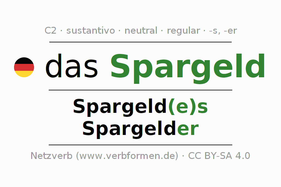 La declinación del sustantivo en forma de tabla con todas su formas: singular, plural y en los cuatro casos: nominativo (primer caso), genitivo (segundo caso), dativo (tercer caso) y acusativo (cuarto caso). Las construcciones gramaticales están representadas de forma clara en una tabla sinópica. La inflexión de los sustantivos es una ayuda durante tareas, exámenes, para cursos de alemán, la universidad, el estudio del alemán como lengua extranjera o como segundo idioma y para estudiantes adultos. La declinación correcta de las palabras es especialmente importante para los que aprenden el idioma alemán. Aquí encontraras más información acerca del tema Wiktionary Spargeld y aquí también a través del Duden Spargeld.
