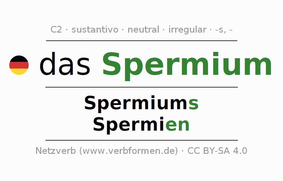 La declinación del sustantivo en forma de tabla con todas su formas: singular, plural y en los cuatro casos: nominativo (primer caso), genitivo (segundo caso), dativo (tercer caso) y acusativo (cuarto caso). Las construcciones gramaticales están representadas de forma clara en una tabla sinópica. La inflexión de los sustantivos es una ayuda durante tareas, exámenes, para cursos de alemán, la universidad, el estudio del alemán como lengua extranjera o como segundo idioma y para estudiantes adultos. La declinación correcta de las palabras es especialmente importante para los que aprenden el idioma alemán. Aquí encontraras más información acerca del tema Wiktionary Spermium y aquí también a través del Duden Spermium.