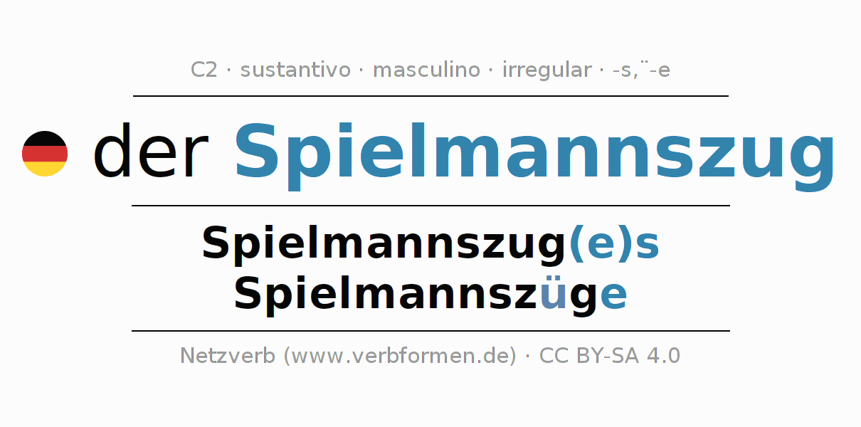 La declinación del sustantivo en forma de tabla con todas su formas: singular, plural y en los cuatro casos: nominativo (primer caso), genitivo (segundo caso), dativo (tercer caso) y acusativo (cuarto caso). Las construcciones gramaticales están representadas de forma clara en una tabla sinópica. La inflexión de los sustantivos es una ayuda durante tareas, exámenes, para cursos de alemán, la universidad, el estudio del alemán como lengua extranjera o como segundo idioma y para estudiantes adultos. La declinación correcta de las palabras es especialmente importante para los que aprenden el idioma alemán. Aquí encontraras más información acerca del tema Wiktionary Spielmannszug y aquí también a través del Duden Spielmannszug.