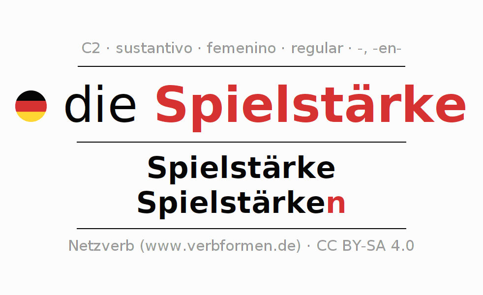 La declinación del sustantivo en forma de tabla con todas su formas: singular, plural y en los cuatro casos: nominativo (primer caso), genitivo (segundo caso), dativo (tercer caso) y acusativo (cuarto caso). Las construcciones gramaticales están representadas de forma clara en una tabla sinópica. La inflexión de los sustantivos es una ayuda durante tareas, exámenes, para cursos de alemán, la universidad, el estudio del alemán como lengua extranjera o como segundo idioma y para estudiantes adultos. La declinación correcta de las palabras es especialmente importante para los que aprenden el idioma alemán. Aquí encontraras más información acerca del tema Wiktionary Spielstärke y aquí también a través del Duden Spielstärke.