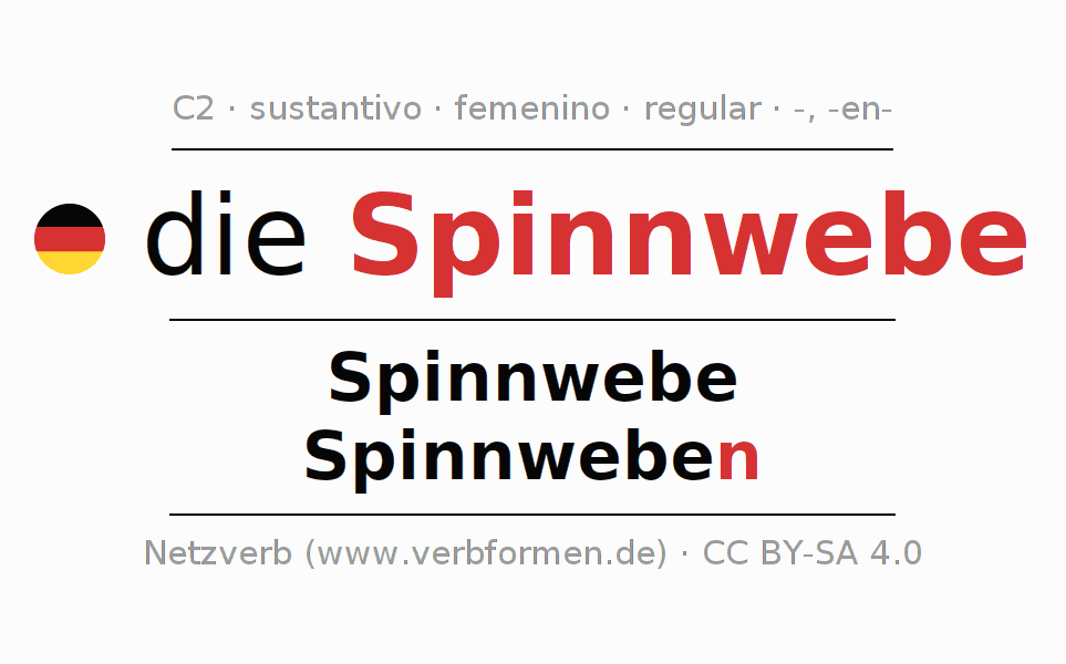 La declinación del sustantivo en forma de tabla con todas su formas: singular, plural y en los cuatro casos: nominativo (primer caso), genitivo (segundo caso), dativo (tercer caso) y acusativo (cuarto caso). Las construcciones gramaticales están representadas de forma clara en una tabla sinópica. La inflexión de los sustantivos es una ayuda durante tareas, exámenes, para cursos de alemán, la universidad, el estudio del alemán como lengua extranjera o como segundo idioma y para estudiantes adultos. La declinación correcta de las palabras es especialmente importante para los que aprenden el idioma alemán. Aquí encontraras más información acerca del tema Wiktionary Spinnwebe y aquí también a través del Duden Spinnwebe.
