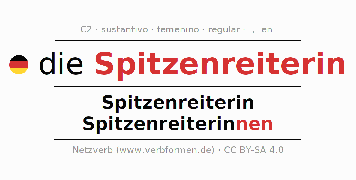 La declinación del sustantivo en forma de tabla con todas su formas: singular, plural y en los cuatro casos: nominativo (primer caso), genitivo (segundo caso), dativo (tercer caso) y acusativo (cuarto caso). Las construcciones gramaticales están representadas de forma clara en una tabla sinópica. La inflexión de los sustantivos es una ayuda durante tareas, exámenes, para cursos de alemán, la universidad, el estudio del alemán como lengua extranjera o como segundo idioma y para estudiantes adultos. La declinación correcta de las palabras es especialmente importante para los que aprenden el idioma alemán. Aquí encontraras más información acerca del tema Wiktionary Spitzenreiterin y aquí también a través del Duden Spitzenreiterin.
