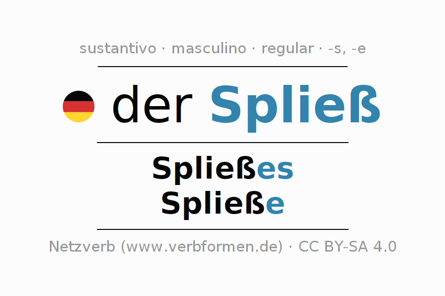 La declinación del sustantivo en forma de tabla con todas su formas: singular, plural y en los cuatro casos: nominativo (primer caso), genitivo (segundo caso), dativo (tercer caso) y acusativo (cuarto caso). Las construcciones gramaticales están representadas de forma clara en una tabla sinópica. La inflexión de los sustantivos es una ayuda durante tareas, exámenes, para cursos de alemán, la universidad, el estudio del alemán como lengua extranjera o como segundo idioma y para estudiantes adultos. La declinación correcta de las palabras es especialmente importante para los que aprenden el idioma alemán. Aquí encontraras más información acerca del tema Wiktionary Spließ y aquí también a través del Duden Spließ.