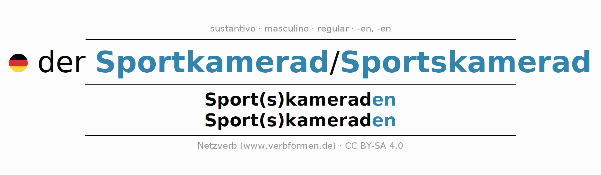 La declinación del sustantivo en forma de tabla con todas su formas: singular, plural y en los cuatro casos: nominativo (primer caso), genitivo (segundo caso), dativo (tercer caso) y acusativo (cuarto caso). Las construcciones gramaticales están representadas de forma clara en una tabla sinópica. La inflexión de los sustantivos es una ayuda durante tareas, exámenes, para cursos de alemán, la universidad, el estudio del alemán como lengua extranjera o como segundo idioma y para estudiantes adultos. La declinación correcta de las palabras es especialmente importante para los que aprenden el idioma alemán. Aquí encontraras más información acerca del tema Wiktionary Sportkamerad y aquí también a través del Duden Sportkamerad.