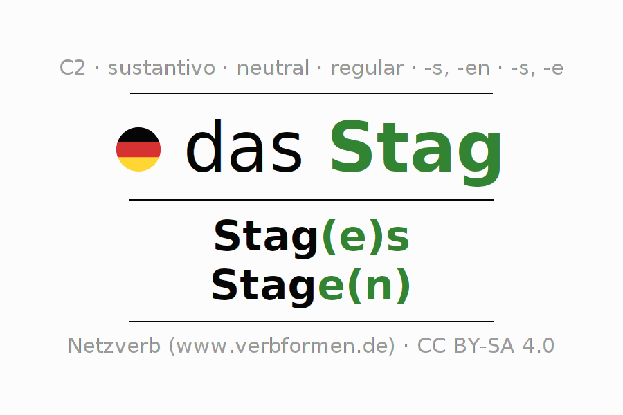 La declinación del sustantivo en forma de tabla con todas su formas: singular, plural y en los cuatro casos: nominativo (primer caso), genitivo (segundo caso), dativo (tercer caso) y acusativo (cuarto caso). Las construcciones gramaticales están representadas de forma clara en una tabla sinópica. La inflexión de los sustantivos es una ayuda durante tareas, exámenes, para cursos de alemán, la universidad, el estudio del alemán como lengua extranjera o como segundo idioma y para estudiantes adultos. La declinación correcta de las palabras es especialmente importante para los que aprenden el idioma alemán. Aquí encontraras más información acerca del tema Wiktionary Stag y aquí también a través del Duden Stag.