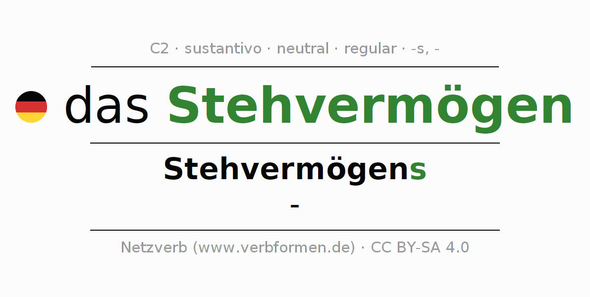 La declinación del sustantivoStehvermögen (resistencia, capacidad de aguante) se encuentra en genitivoStehvermögens del singular y en el nominativo- del plural. El sustantivo Stehvermögen se conjuga de forma fuerte (irregular) con estas terminaciones s/-. No permite construcciones en plural. El género gramatical de Stehvermögen es neutro y por eso se requiere el artículo definido ‘das’. Aquí puedes declinar no solamente Stehvermögen sino también todos los sustantivos alemanes . Este sustantivo pertenece al vocabulario necesario para pasar el examen "Zertifikat Deutsch" o para el nivel C2. Comentarios ☆