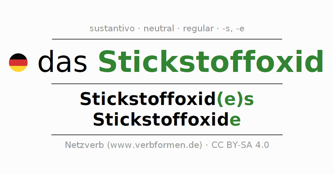 La declinación del sustantivo en forma de tabla con todas su formas: singular, plural y en los cuatro casos: nominativo (primer caso), genitivo (segundo caso), dativo (tercer caso) y acusativo (cuarto caso). Las construcciones gramaticales están representadas de forma clara en una tabla sinópica. La inflexión de los sustantivos es una ayuda durante tareas, exámenes, para cursos de alemán, la universidad, el estudio del alemán como lengua extranjera o como segundo idioma y para estudiantes adultos. La declinación correcta de las palabras es especialmente importante para los que aprenden el idioma alemán. Aquí encontraras más información acerca del tema Wiktionary Stickstoffoxid y aquí también a través del Duden Stickstoffoxid.