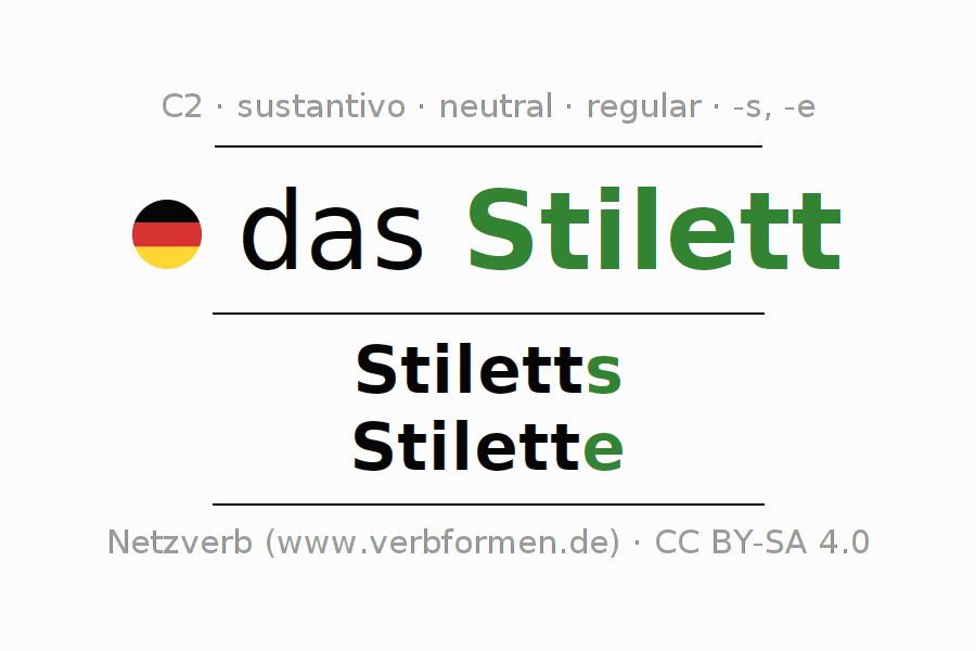 La declinación del sustantivo en forma de tabla con todas su formas: singular, plural y en los cuatro casos: nominativo (primer caso), genitivo (segundo caso), dativo (tercer caso) y acusativo (cuarto caso). Las construcciones gramaticales están representadas de forma clara en una tabla sinópica. La inflexión de los sustantivos es una ayuda durante tareas, exámenes, para cursos de alemán, la universidad, el estudio del alemán como lengua extranjera o como segundo idioma y para estudiantes adultos. La declinación correcta de las palabras es especialmente importante para los que aprenden el idioma alemán. Aquí encontraras más información acerca del tema Wiktionary Stilett y aquí también a través del Duden Stilett.