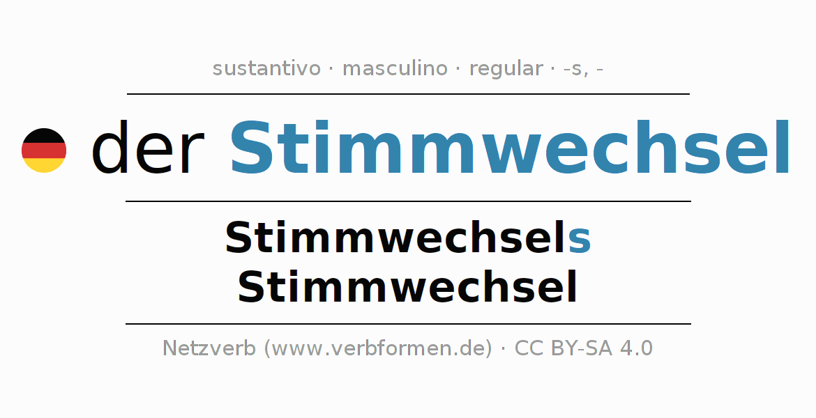 La declinación del sustantivoStimmwechsel (cambio de voz) se encuentra en genitivoStimmwechsels del singular y en el nominativoStimmwechsel del plural. El sustantivo Stimmwechsel se conjuga de forma fuerte (irregular) con estas terminaciones s/-. El género gramatical de Stimmwechsel es masculino y por eso se requiere el artículo definido ‘der’. Aquí puedes declinar no solamente Stimmwechsel sino también todos los sustantivos alemanes . Comentarios ☆