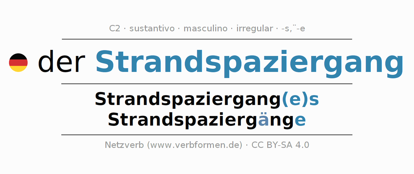 La declinación del sustantivo en forma de tabla con todas su formas: singular, plural y en los cuatro casos: nominativo (primer caso), genitivo (segundo caso), dativo (tercer caso) y acusativo (cuarto caso). Las construcciones gramaticales están representadas de forma clara en una tabla sinópica. La inflexión de los sustantivos es una ayuda durante tareas, exámenes, para cursos de alemán, la universidad, el estudio del alemán como lengua extranjera o como segundo idioma y para estudiantes adultos. La declinación correcta de las palabras es especialmente importante para los que aprenden el idioma alemán. Aquí encontraras más información acerca del tema Wiktionary Strandspaziergang y aquí también a través del Duden Strandspaziergang.