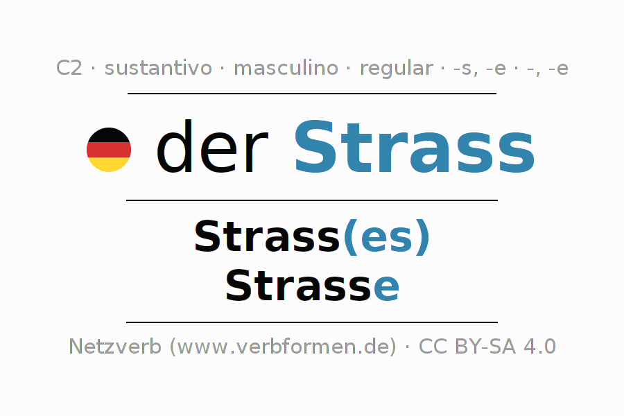 La declinación del sustantivoStrass (strass) se encuentra en genitivoStrass(es) del singular y en el nominativoStrasse del plural. El sustantivo Strass se conjuga de forma fuerte (irregular) con estas terminaciones es/-/e. El género gramatical de Strass es masculino y por eso se requiere el artículo definido ‘der’. Aquí puedes declinar no solamente Strass sino también todos los sustantivos alemanes . Este sustantivo pertenece al vocabulario necesario para pasar el examen "Zertifikat Deutsch" o para el nivel C2. Comentarios ☆