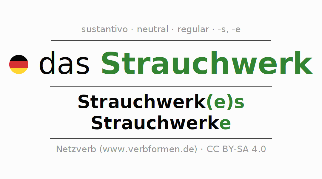 La declinación del sustantivo en forma de tabla con todas su formas: singular, plural y en los cuatro casos: nominativo (primer caso), genitivo (segundo caso), dativo (tercer caso) y acusativo (cuarto caso). Las construcciones gramaticales están representadas de forma clara en una tabla sinópica. La inflexión de los sustantivos es una ayuda durante tareas, exámenes, para cursos de alemán, la universidad, el estudio del alemán como lengua extranjera o como segundo idioma y para estudiantes adultos. La declinación correcta de las palabras es especialmente importante para los que aprenden el idioma alemán. Aquí encontraras más información acerca del tema Wiktionary Strauchwerk y aquí también a través del Duden Strauchwerk.