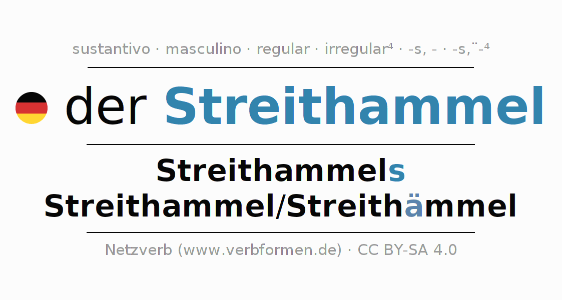 La declinación del sustantivoStreithammel (buscapleitos, buscarruidos) se encuentra en genitivoStreithammels del singular y en el nominativoStreithammel/Streithämmel del plural. El sustantivo Streithammel se conjuga de forma fuerte (irregular) con estas terminaciones s/-/ä-. El plural requiere el uso de diéresis. El género gramatical de Streithammel es masculino y por eso se requiere el artículo definido ‘der’. Aquí puedes declinar no solamente Streithammel sino también todos los sustantivos alemanes . Comentarios ☆