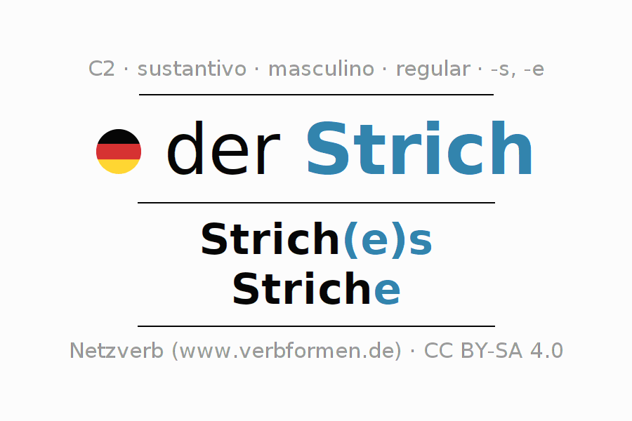 La declinación del sustantivo en forma de tabla con todas su formas: singular, plural y en los cuatro casos: nominativo (primer caso), genitivo (segundo caso), dativo (tercer caso) y acusativo (cuarto caso). Las construcciones gramaticales están representadas de forma clara en una tabla sinópica. La inflexión de los sustantivos es una ayuda durante tareas, exámenes, para cursos de alemán, la universidad, el estudio del alemán como lengua extranjera o como segundo idioma y para estudiantes adultos. La declinación correcta de las palabras es especialmente importante para los que aprenden el idioma alemán. Aquí encontraras más información acerca del tema Wiktionary Strich y aquí también a través del Duden Strich.