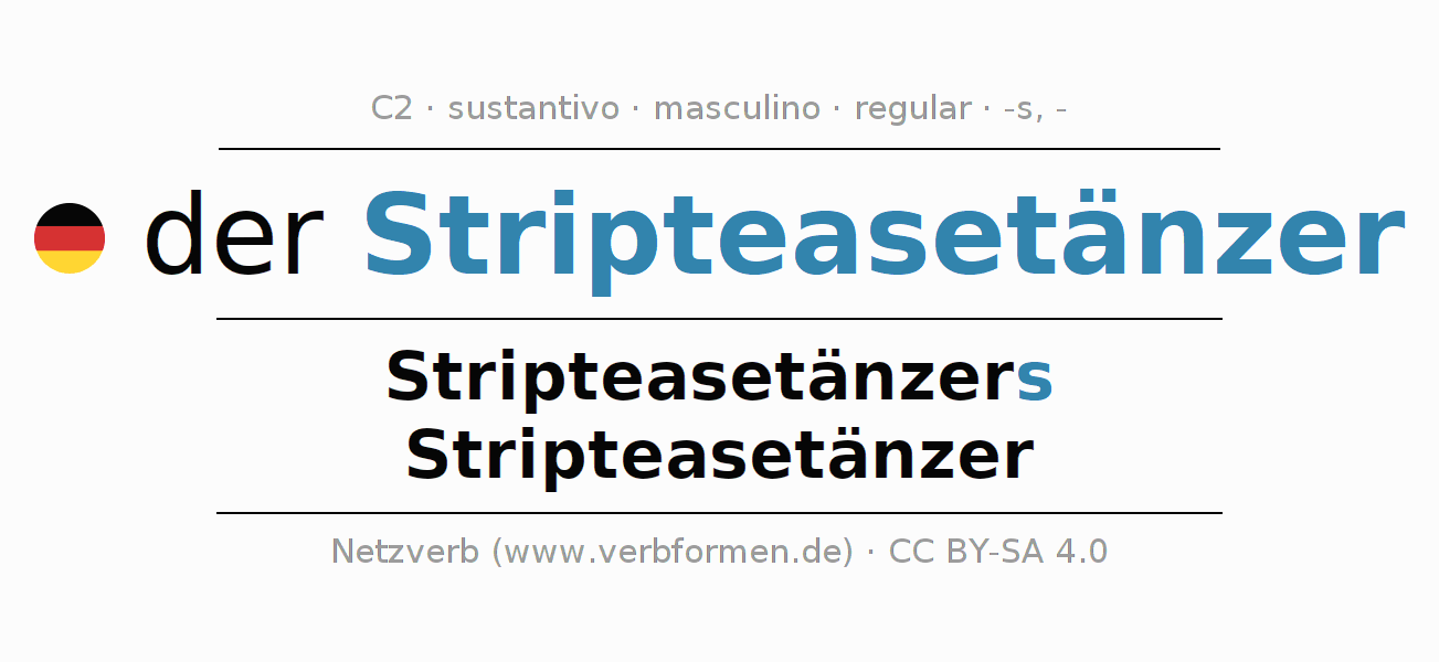 La declinación del sustantivo en forma de tabla con todas su formas: singular, plural y en los cuatro casos: nominativo (primer caso), genitivo (segundo caso), dativo (tercer caso) y acusativo (cuarto caso). Las construcciones gramaticales están representadas de forma clara en una tabla sinópica. La inflexión de los sustantivos es una ayuda durante tareas, exámenes, para cursos de alemán, la universidad, el estudio del alemán como lengua extranjera o como segundo idioma y para estudiantes adultos. La declinación correcta de las palabras es especialmente importante para los que aprenden el idioma alemán. Aquí encontraras más información acerca del tema Wiktionary Stripteasetänzer y aquí también a través del Duden Stripteasetänzer.