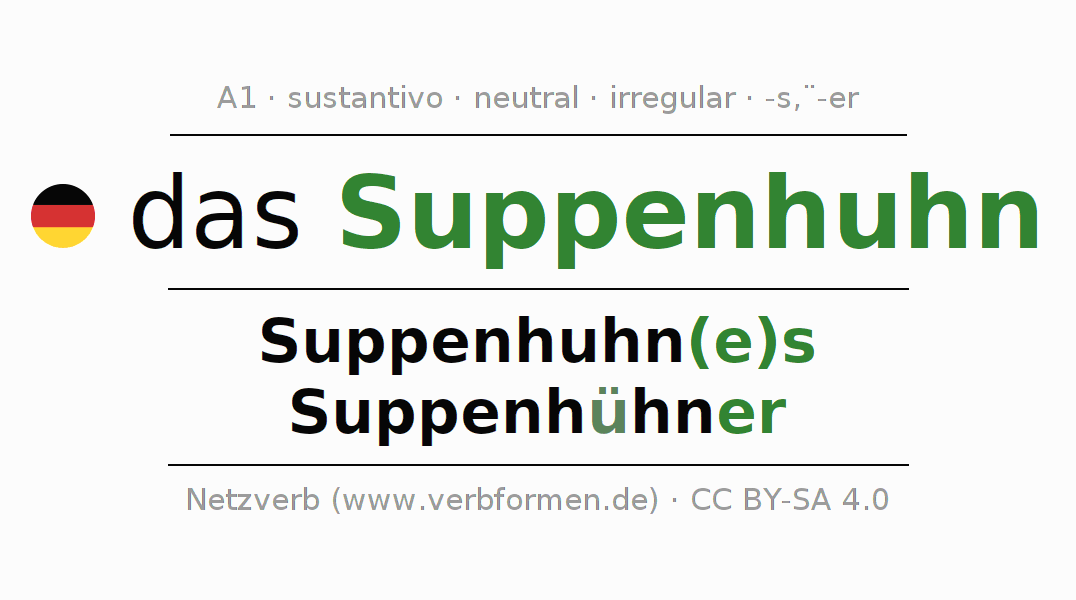 La declinación del sustantivo en forma de tabla con todas su formas: singular, plural y en los cuatro casos: nominativo (primer caso), genitivo (segundo caso), dativo (tercer caso) y acusativo (cuarto caso). Las construcciones gramaticales están representadas de forma clara en una tabla sinópica. La inflexión de los sustantivos es una ayuda durante tareas, exámenes, para cursos de alemán, la universidad, el estudio del alemán como lengua extranjera o como segundo idioma y para estudiantes adultos. La declinación correcta de las palabras es especialmente importante para los que aprenden el idioma alemán. Aquí encontraras más información acerca del tema Wiktionary Suppenhuhn y aquí también a través del Duden Suppenhuhn.