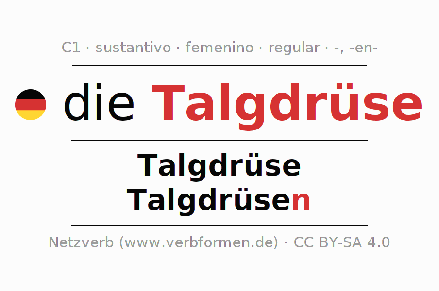 La declinación del sustantivo en forma de tabla con todas su formas: singular, plural y en los cuatro casos: nominativo (primer caso), genitivo (segundo caso), dativo (tercer caso) y acusativo (cuarto caso). Las construcciones gramaticales están representadas de forma clara en una tabla sinópica. La inflexión de los sustantivos es una ayuda durante tareas, exámenes, para cursos de alemán, la universidad, el estudio del alemán como lengua extranjera o como segundo idioma y para estudiantes adultos. La declinación correcta de las palabras es especialmente importante para los que aprenden el idioma alemán. Aquí encontraras más información acerca del tema Wiktionary Talgdrüse y aquí también a través del Duden Talgdrüse.