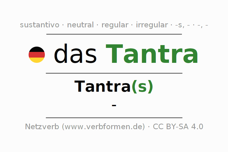 La declinación del sustantivoTantra se encuentra en genitivoTantra(s) del singular y en el nominativo- del plural. El sustantivo Tantra se conjuga de forma fuerte (irregular) con estas terminaciones s/-/-. No permite construcciones en plural. El género gramatical de Tantra es neutro y por eso se requiere el artículo definido ‘das’. Aquí puedes declinar no solamente Tantra sino también todos los sustantivos alemanes . Comentarios ☆
