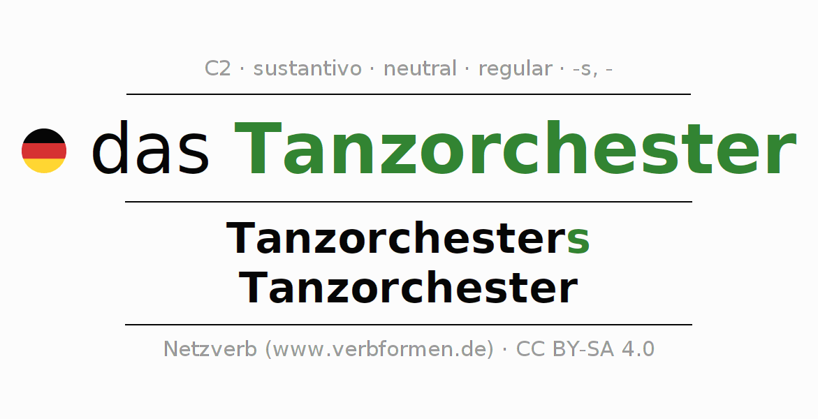 La declinación del sustantivo en forma de tabla con todas su formas: singular, plural y en los cuatro casos: nominativo (primer caso), genitivo (segundo caso), dativo (tercer caso) y acusativo (cuarto caso). Las construcciones gramaticales están representadas de forma clara en una tabla sinópica. La inflexión de los sustantivos es una ayuda durante tareas, exámenes, para cursos de alemán, la universidad, el estudio del alemán como lengua extranjera o como segundo idioma y para estudiantes adultos. La declinación correcta de las palabras es especialmente importante para los que aprenden el idioma alemán. Aquí encontraras más información acerca del tema Wiktionary Tanzorchester y aquí también a través del Duden Tanzorchester.
