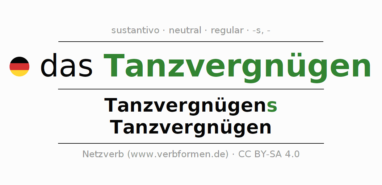 La declinación del sustantivo en forma de tabla con todas su formas: singular, plural y en los cuatro casos: nominativo (primer caso), genitivo (segundo caso), dativo (tercer caso) y acusativo (cuarto caso). Las construcciones gramaticales están representadas de forma clara en una tabla sinópica. La inflexión de los sustantivos es una ayuda durante tareas, exámenes, para cursos de alemán, la universidad, el estudio del alemán como lengua extranjera o como segundo idioma y para estudiantes adultos. La declinación correcta de las palabras es especialmente importante para los que aprenden el idioma alemán. Aquí encontraras más información acerca del tema Wiktionary Tanzvergnügen y aquí también a través del Duden Tanzvergnügen.