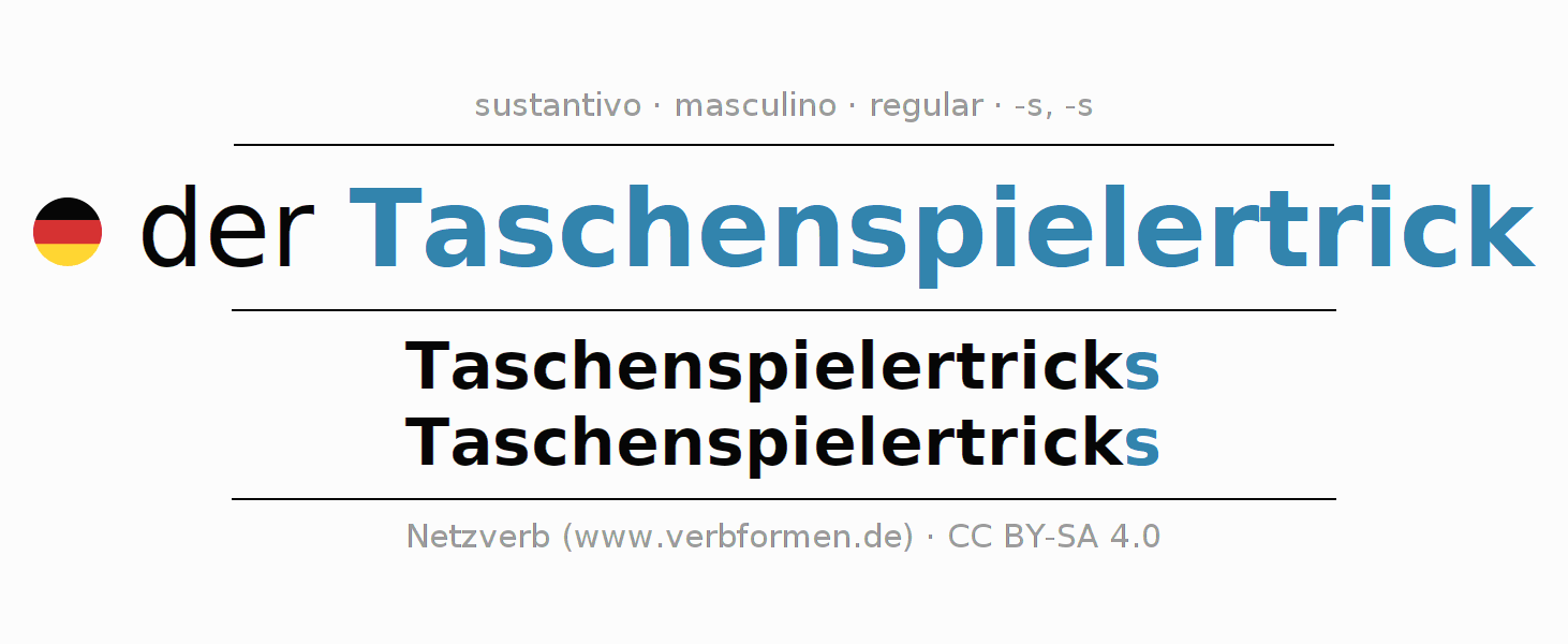 La declinación del sustantivo en forma de tabla con todas su formas: singular, plural y en los cuatro casos: nominativo (primer caso), genitivo (segundo caso), dativo (tercer caso) y acusativo (cuarto caso). Las construcciones gramaticales están representadas de forma clara en una tabla sinópica. La inflexión de los sustantivos es una ayuda durante tareas, exámenes, para cursos de alemán, la universidad, el estudio del alemán como lengua extranjera o como segundo idioma y para estudiantes adultos. La declinación correcta de las palabras es especialmente importante para los que aprenden el idioma alemán. Aquí encontraras más información acerca del tema Wiktionary Taschenspielertrick y aquí también a través del Duden Taschenspielertrick.