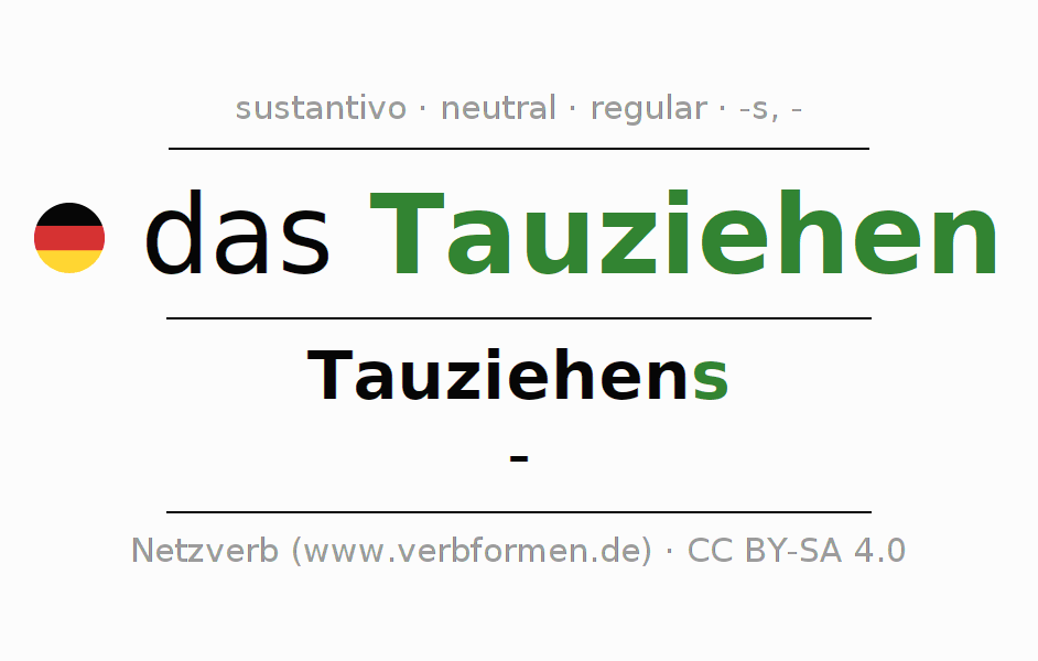 La declinación del sustantivo en forma de tabla con todas su formas: singular, plural y en los cuatro casos: nominativo (primer caso), genitivo (segundo caso), dativo (tercer caso) y acusativo (cuarto caso). Las construcciones gramaticales están representadas de forma clara en una tabla sinópica. La inflexión de los sustantivos es una ayuda durante tareas, exámenes, para cursos de alemán, la universidad, el estudio del alemán como lengua extranjera o como segundo idioma y para estudiantes adultos. La declinación correcta de las palabras es especialmente importante para los que aprenden el idioma alemán. Aquí encontraras más información acerca del tema Wiktionary Tauziehen y aquí también a través del Duden Tauziehen.