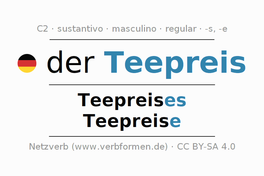 La declinación del sustantivoTeepreis (precio del té) se encuentra en genitivoTeepreises del singular y en el nominativoTeepreise del plural. El sustantivo Teepreis se conjuga de forma fuerte (irregular) con estas terminaciones es/e. El género gramatical de Teepreis es masculino y por eso se requiere el artículo definido ‘der’. Aquí puedes declinar no solamente Teepreis sino también todos los sustantivos alemanes . Este sustantivo pertenece al vocabulario necesario para pasar el examen "Zertifikat Deutsch" o para el nivel C2. Comentarios ☆
