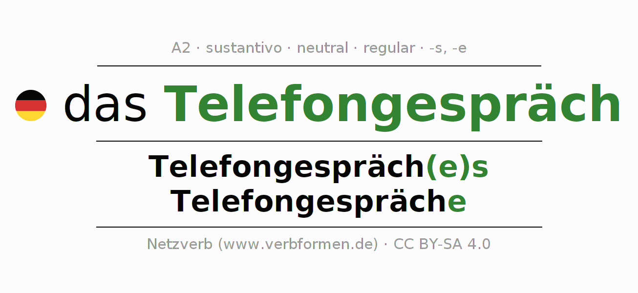 La declinación del sustantivo en forma de tabla con todas su formas: singular, plural y en los cuatro casos: nominativo (primer caso), genitivo (segundo caso), dativo (tercer caso) y acusativo (cuarto caso). Las construcciones gramaticales están representadas de forma clara en una tabla sinópica. La inflexión de los sustantivos es una ayuda durante tareas, exámenes, para cursos de alemán, la universidad, el estudio del alemán como lengua extranjera o como segundo idioma y para estudiantes adultos. La declinación correcta de las palabras es especialmente importante para los que aprenden el idioma alemán. Aquí encontraras más información acerca del tema Wiktionary Telefongespräch y aquí también a través del Duden Telefongespräch.