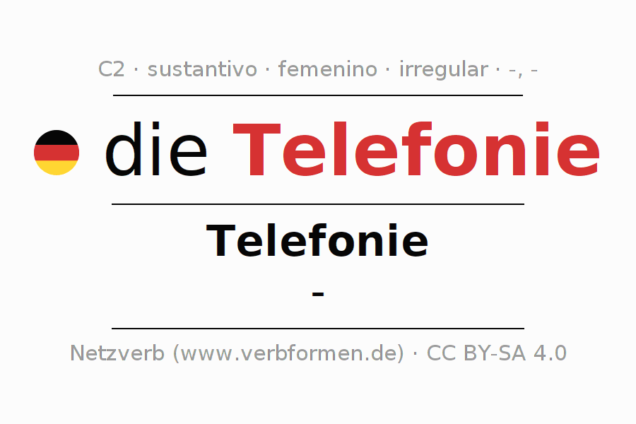 La declinación del sustantivoTelefonie (telefonía, telefonia) se encuentra en genitivoTelefonie del singular y en el nominativo- del plural. El sustantivo Telefonie se declina con las terminaciones -/-. No permite construcciones en plural. El género gramatical de Telefonie es femenino y por eso se requiere el artículo definido ‘die’. Aquí puedes declinar no solamente Telefonie sino también todos los sustantivos alemanes . Este sustantivo pertenece al vocabulario necesario para pasar el examen "Zertifikat Deutsch" o para el nivel C2. Comentarios ☆