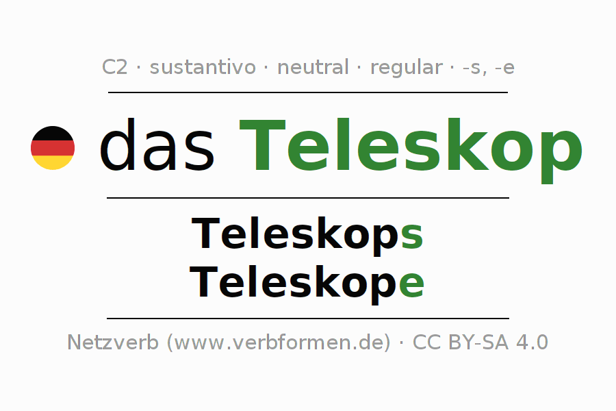 La declinación del sustantivoTeleskop (telescopio) se encuentra en genitivoTeleskops del singular y en el nominativoTeleskope del plural. El sustantivo Teleskop se conjuga de forma fuerte (irregular) con estas terminaciones s/e. El género gramatical de Teleskop es neutro y por eso se requiere el artículo definido ‘das’. Aquí puedes declinar no solamente Teleskop sino también todos los sustantivos alemanes . Este sustantivo pertenece al vocabulario necesario para pasar el examen "Zertifikat Deutsch" o para el nivel C2. Comentarios ☆