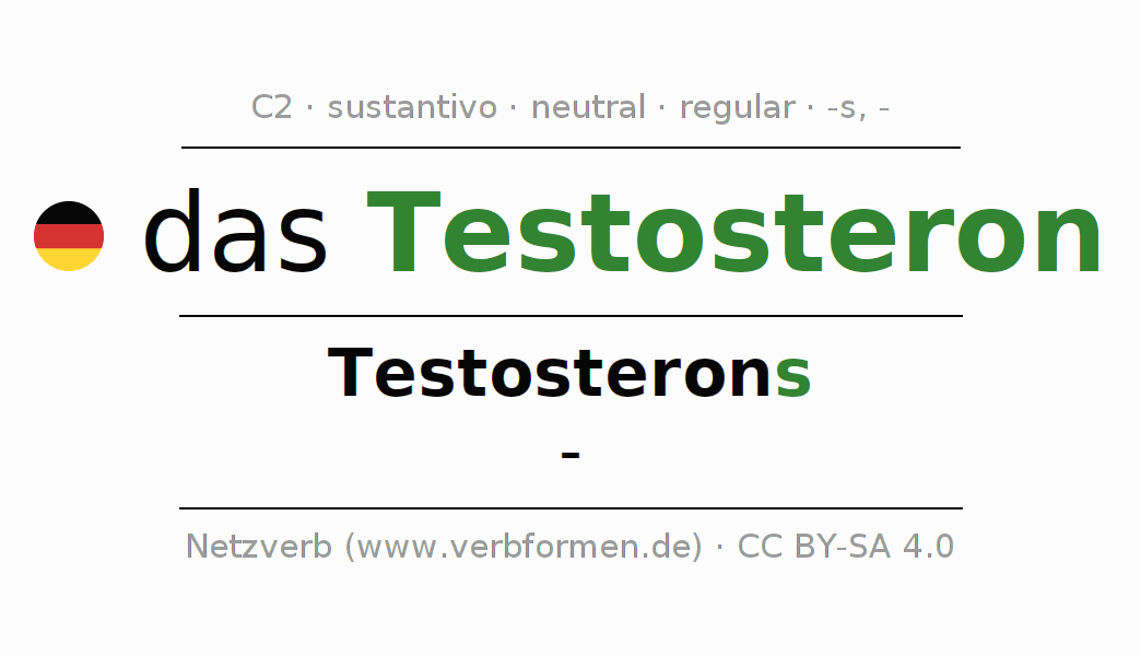 La declinación del sustantivoTestosteron (testosterona) se encuentra en genitivoTestosterons del singular y en el nominativo- del plural. El sustantivo Testosteron se conjuga de forma fuerte (irregular) con estas terminaciones s/-. No permite construcciones en plural. El género gramatical de Testosteron es neutro y por eso se requiere el artículo definido ‘das’. Aquí puedes declinar no solamente Testosteron sino también todos los sustantivos alemanes . Este sustantivo pertenece al vocabulario necesario para pasar el examen "Zertifikat Deutsch" o para el nivel C2. Comentarios ☆