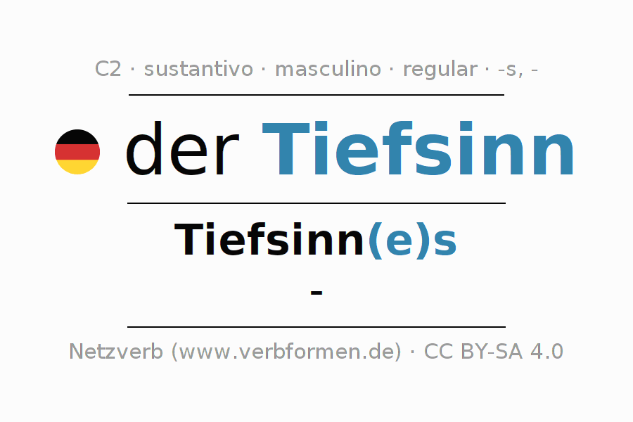 La declinación del sustantivo en forma de tabla con todas su formas: singular, plural y en los cuatro casos: nominativo (primer caso), genitivo (segundo caso), dativo (tercer caso) y acusativo (cuarto caso). Las construcciones gramaticales están representadas de forma clara en una tabla sinópica. La inflexión de los sustantivos es una ayuda durante tareas, exámenes, para cursos de alemán, la universidad, el estudio del alemán como lengua extranjera o como segundo idioma y para estudiantes adultos. La declinación correcta de las palabras es especialmente importante para los que aprenden el idioma alemán. Aquí encontraras más información acerca del tema Wiktionary Tiefsinn y aquí también a través del Duden Tiefsinn.