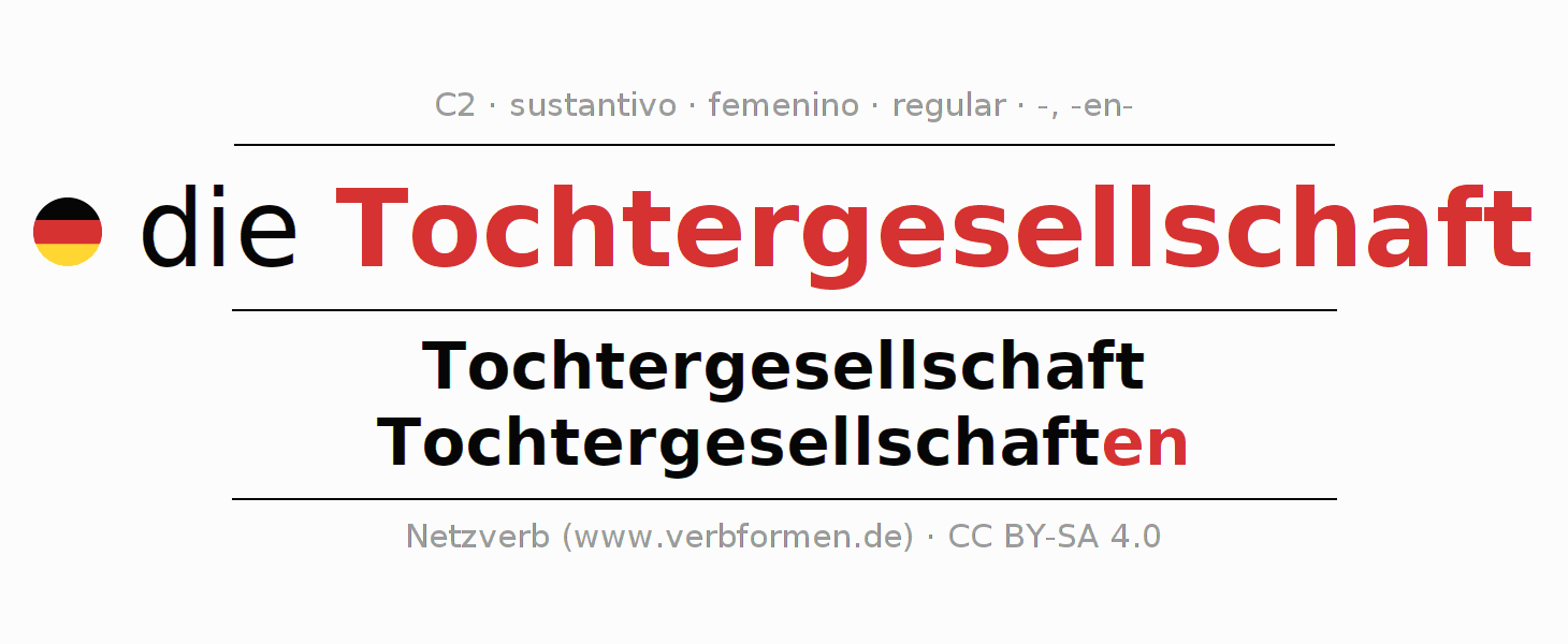 La declinación del sustantivo en forma de tabla con todas su formas: singular, plural y en los cuatro casos: nominativo (primer caso), genitivo (segundo caso), dativo (tercer caso) y acusativo (cuarto caso). Las construcciones gramaticales están representadas de forma clara en una tabla sinópica. La inflexión de los sustantivos es una ayuda durante tareas, exámenes, para cursos de alemán, la universidad, el estudio del alemán como lengua extranjera o como segundo idioma y para estudiantes adultos. La declinación correcta de las palabras es especialmente importante para los que aprenden el idioma alemán. Aquí encontraras más información acerca del tema Wiktionary Tochtergesellschaft y aquí también a través del Duden Tochtergesellschaft.