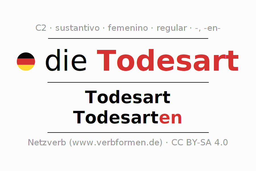 La declinación del sustantivo en forma de tabla con todas su formas: singular, plural y en los cuatro casos: nominativo (primer caso), genitivo (segundo caso), dativo (tercer caso) y acusativo (cuarto caso). Las construcciones gramaticales están representadas de forma clara en una tabla sinópica. La inflexión de los sustantivos es una ayuda durante tareas, exámenes, para cursos de alemán, la universidad, el estudio del alemán como lengua extranjera o como segundo idioma y para estudiantes adultos. La declinación correcta de las palabras es especialmente importante para los que aprenden el idioma alemán. Aquí encontraras más información acerca del tema Wiktionary Todesart y aquí también a través del Duden Todesart.