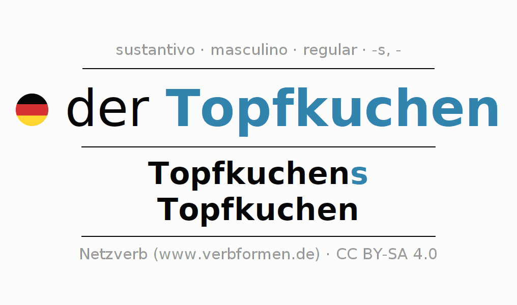 La declinación del sustantivo en forma de tabla con todas su formas: singular, plural y en los cuatro casos: nominativo (primer caso), genitivo (segundo caso), dativo (tercer caso) y acusativo (cuarto caso). Las construcciones gramaticales están representadas de forma clara en una tabla sinópica. La inflexión de los sustantivos es una ayuda durante tareas, exámenes, para cursos de alemán, la universidad, el estudio del alemán como lengua extranjera o como segundo idioma y para estudiantes adultos. La declinación correcta de las palabras es especialmente importante para los que aprenden el idioma alemán. Aquí encontraras más información acerca del tema Wiktionary Topfkuchen y aquí también a través del Duden Topfkuchen.