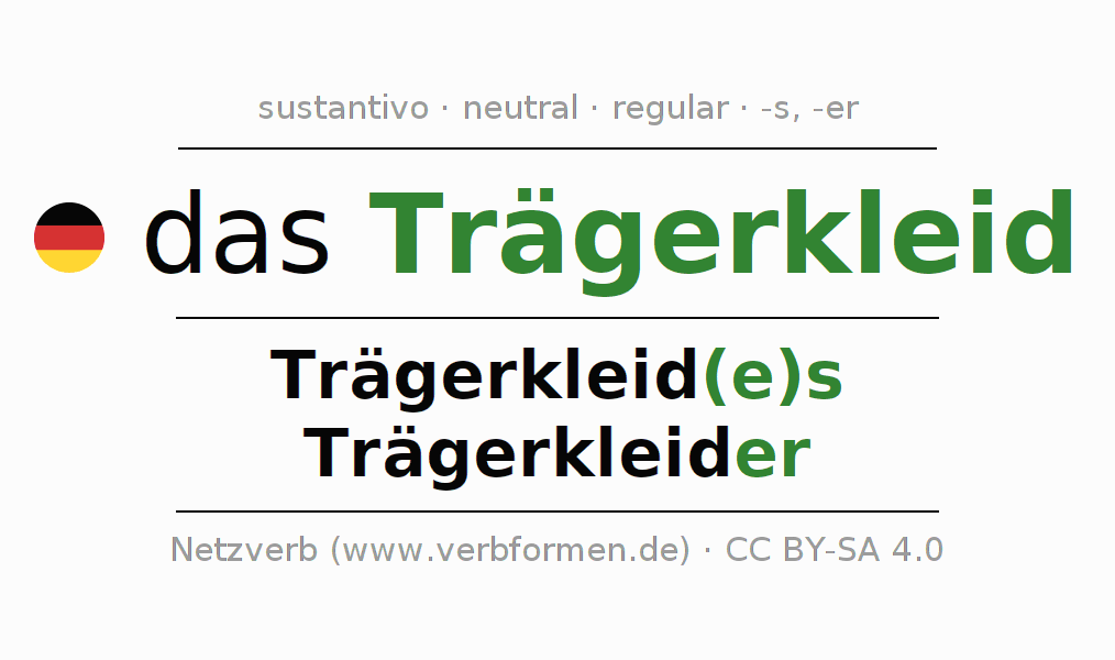 La declinación del sustantivo en forma de tabla con todas su formas: singular, plural y en los cuatro casos: nominativo (primer caso), genitivo (segundo caso), dativo (tercer caso) y acusativo (cuarto caso). Las construcciones gramaticales están representadas de forma clara en una tabla sinópica. La inflexión de los sustantivos es una ayuda durante tareas, exámenes, para cursos de alemán, la universidad, el estudio del alemán como lengua extranjera o como segundo idioma y para estudiantes adultos. La declinación correcta de las palabras es especialmente importante para los que aprenden el idioma alemán. Aquí encontraras más información acerca del tema Wiktionary Trägerkleid y aquí también a través del Duden Trägerkleid.