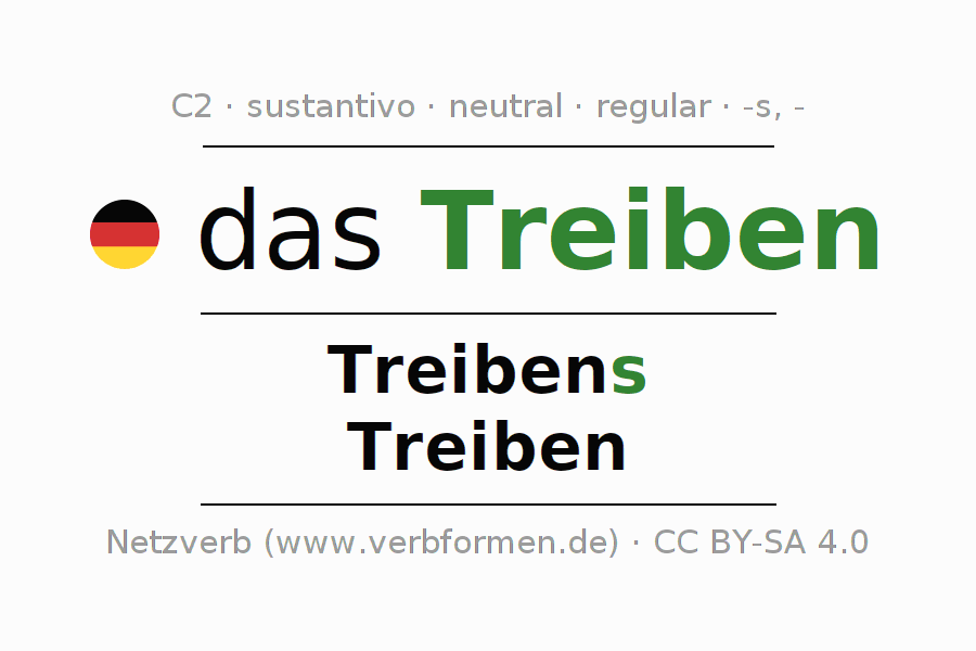 La declinación del sustantivo en forma de tabla con todas su formas: singular, plural y en los cuatro casos: nominativo (primer caso), genitivo (segundo caso), dativo (tercer caso) y acusativo (cuarto caso). Las construcciones gramaticales están representadas de forma clara en una tabla sinópica. La inflexión de los sustantivos es una ayuda durante tareas, exámenes, para cursos de alemán, la universidad, el estudio del alemán como lengua extranjera o como segundo idioma y para estudiantes adultos. La declinación correcta de las palabras es especialmente importante para los que aprenden el idioma alemán. Aquí encontraras más información acerca del tema Wiktionary Treiben y aquí también a través del Duden Treiben.