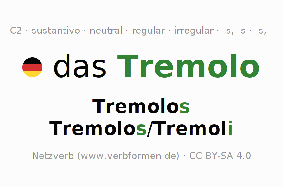 La declinación del sustantivoTremolo (trémolo) se encuentra en genitivoTremolos del singular y en el nominativoTremolos/Tremoli del plural. El sustantivo Tremolo se conjuga de forma fuerte (irregular) con estas terminaciones s/o/i. El género gramatical de Tremolo es neutro y por eso se requiere el artículo definido ‘das’. Aquí puedes declinar no solamente Tremolo sino también todos los sustantivos alemanes . Este sustantivo pertenece al vocabulario necesario para pasar el examen "Zertifikat Deutsch" o para el nivel C2. Comentarios ☆