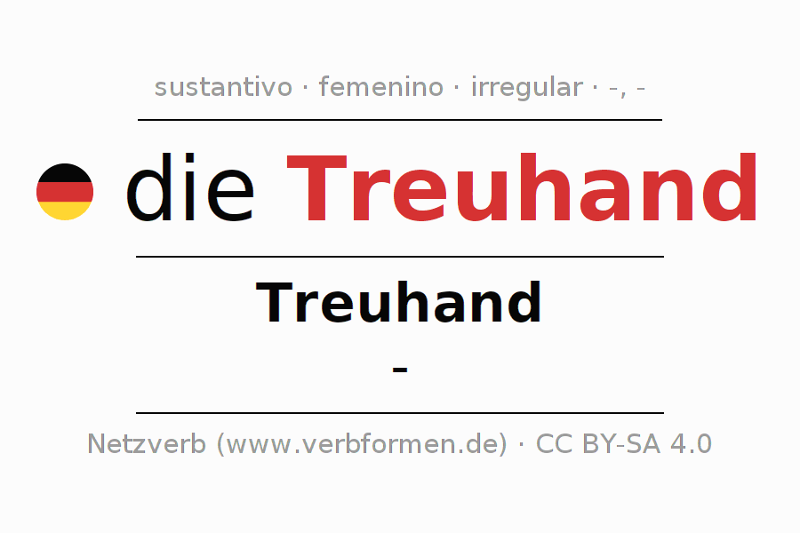 La declinación del sustantivoTreuhand (depósito fiduciario, administración fiduciaria) se encuentra en genitivoTreuhand del singular y en el nominativo- del plural. El sustantivo Treuhand se declina con las terminaciones -/-. No permite construcciones en plural. El género gramatical de Treuhand es femenino y por eso se requiere el artículo definido ‘die’. Aquí puedes declinar no solamente Treuhand sino también todos los sustantivos alemanes . Comentarios ☆