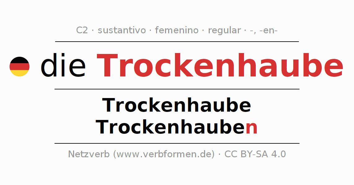 La declinación del sustantivo en forma de tabla con todas su formas: singular, plural y en los cuatro casos: nominativo (primer caso), genitivo (segundo caso), dativo (tercer caso) y acusativo (cuarto caso). Las construcciones gramaticales están representadas de forma clara en una tabla sinópica. La inflexión de los sustantivos es una ayuda durante tareas, exámenes, para cursos de alemán, la universidad, el estudio del alemán como lengua extranjera o como segundo idioma y para estudiantes adultos. La declinación correcta de las palabras es especialmente importante para los que aprenden el idioma alemán. Aquí encontraras más información acerca del tema Wiktionary Trockenhaube y aquí también a través del Duden Trockenhaube.