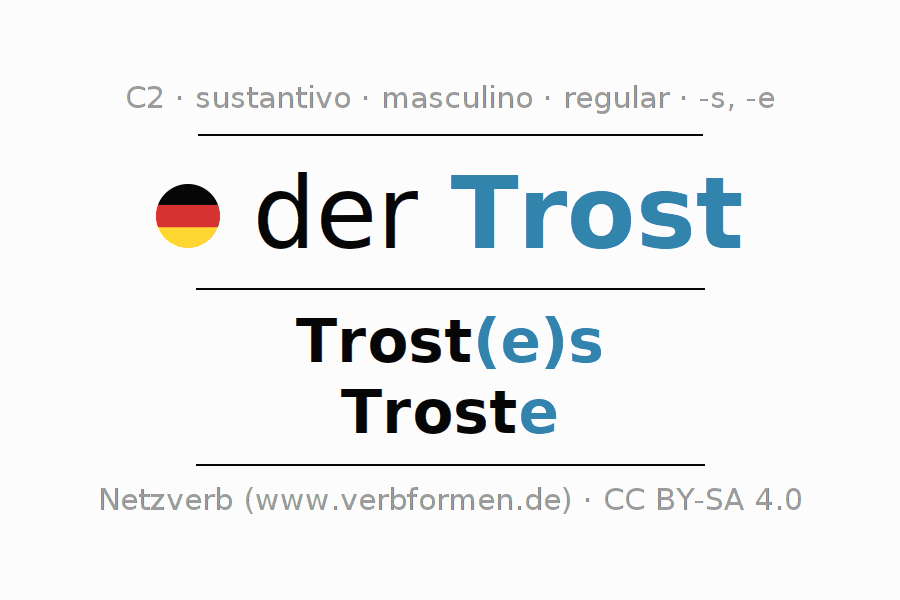 La declinación del sustantivo en forma de tabla con todas su formas: singular, plural y en los cuatro casos: nominativo (primer caso), genitivo (segundo caso), dativo (tercer caso) y acusativo (cuarto caso). Las construcciones gramaticales están representadas de forma clara en una tabla sinópica. La inflexión de los sustantivos es una ayuda durante tareas, exámenes, para cursos de alemán, la universidad, el estudio del alemán como lengua extranjera o como segundo idioma y para estudiantes adultos. La declinación correcta de las palabras es especialmente importante para los que aprenden el idioma alemán. Aquí encontraras más información acerca del tema Wiktionary Trost y aquí también a través del Duden Trost.