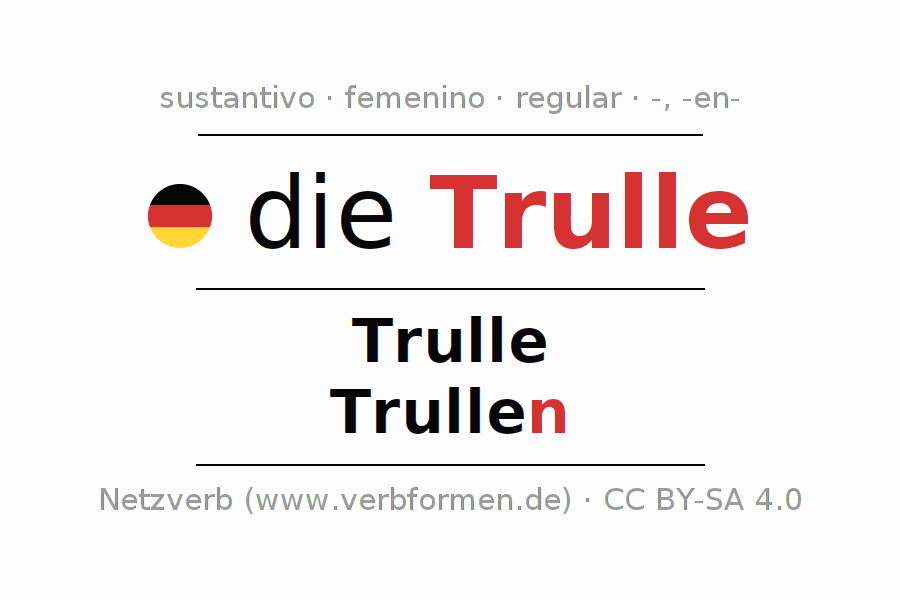 La declinación del sustantivoTrulle (mujer desordenada, mujer frívola) se encuentra en genitivoTrulle del singular y en el nominativoTrullen del plural. El sustantivo Trulle se declina de forma débil con las terminaciones -/n. El género gramatical de Trulle es femenino y por eso se requiere el artículo definido ‘die’. Aquí puedes declinar no solamente Trulle sino también todos los sustantivos alemanes . Comentarios ☆