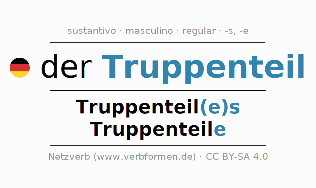 La declinación del sustantivo en forma de tabla con todas su formas: singular, plural y en los cuatro casos: nominativo (primer caso), genitivo (segundo caso), dativo (tercer caso) y acusativo (cuarto caso). Las construcciones gramaticales están representadas de forma clara en una tabla sinópica. La inflexión de los sustantivos es una ayuda durante tareas, exámenes, para cursos de alemán, la universidad, el estudio del alemán como lengua extranjera o como segundo idioma y para estudiantes adultos. La declinación correcta de las palabras es especialmente importante para los que aprenden el idioma alemán. Aquí encontraras más información acerca del tema Wiktionary Truppenteil y aquí también a través del Duden Truppenteil.