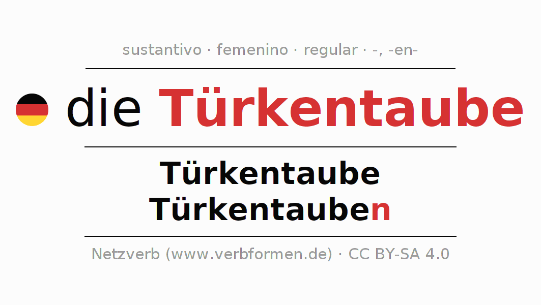 La declinación del sustantivo en forma de tabla con todas su formas: singular, plural y en los cuatro casos: nominativo (primer caso), genitivo (segundo caso), dativo (tercer caso) y acusativo (cuarto caso). Las construcciones gramaticales están representadas de forma clara en una tabla sinópica. La inflexión de los sustantivos es una ayuda durante tareas, exámenes, para cursos de alemán, la universidad, el estudio del alemán como lengua extranjera o como segundo idioma y para estudiantes adultos. La declinación correcta de las palabras es especialmente importante para los que aprenden el idioma alemán. Aquí encontraras más información acerca del tema Wiktionary Türkentaube y aquí también a través del Duden Türkentaube.