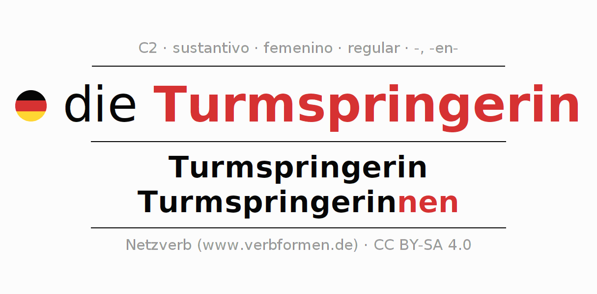La declinación del sustantivo en forma de tabla con todas su formas: singular, plural y en los cuatro casos: nominativo (primer caso), genitivo (segundo caso), dativo (tercer caso) y acusativo (cuarto caso). Las construcciones gramaticales están representadas de forma clara en una tabla sinópica. La inflexión de los sustantivos es una ayuda durante tareas, exámenes, para cursos de alemán, la universidad, el estudio del alemán como lengua extranjera o como segundo idioma y para estudiantes adultos. La declinación correcta de las palabras es especialmente importante para los que aprenden el idioma alemán. Aquí encontraras más información acerca del tema Wiktionary Turmspringerin y aquí también a través del Duden Turmspringerin.