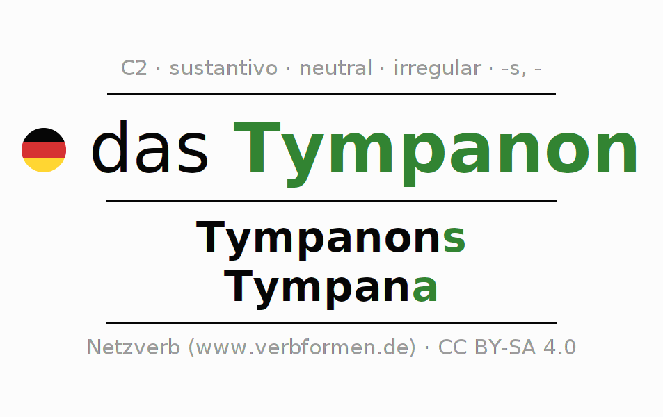 La declinación del sustantivoTympanon (tímpano, frontón) se encuentra en genitivoTympanons del singular y en el nominativoTympana del plural. El sustantivo Tympanon se declina con las terminaciones s/a. El género gramatical de Tympanon es neutro y por eso se requiere el artículo definido ‘das’. Aquí puedes declinar no solamente Tympanon sino también todos los sustantivos alemanes . Este sustantivo pertenece al vocabulario necesario para pasar el examen "Zertifikat Deutsch" o para el nivel C2. Comentarios ☆