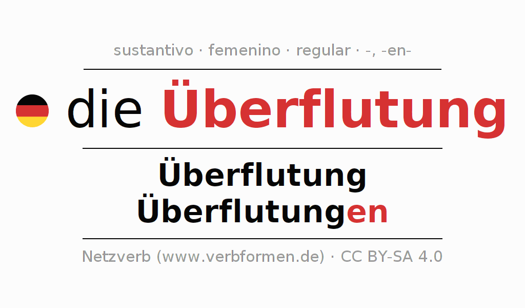 La declinación del sustantivo en forma de tabla con todas su formas: singular, plural y en los cuatro casos: nominativo (primer caso), genitivo (segundo caso), dativo (tercer caso) y acusativo (cuarto caso). Las construcciones gramaticales están representadas de forma clara en una tabla sinópica. La inflexión de los sustantivos es una ayuda durante tareas, exámenes, para cursos de alemán, la universidad, el estudio del alemán como lengua extranjera o como segundo idioma y para estudiantes adultos. La declinación correcta de las palabras es especialmente importante para los que aprenden el idioma alemán. Aquí encontraras más información acerca del tema Wiktionary Überflutung y aquí también a través del Duden Überflutung.
