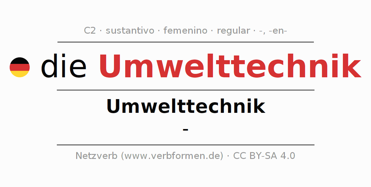 La declinación del sustantivoUmwelttechnik (ingeniería ambiental, ingeniería medioambiental) se encuentra en genitivoUmwelttechnik del singular y en el nominativo- del plural. El sustantivo Umwelttechnik se declina de forma débil con las terminaciones -/-. No permite construcciones en plural. El género gramatical de Umwelttechnik es femenino y por eso se requiere el artículo definido ‘die’. Aquí puedes declinar no solamente Umwelttechnik sino también todos los sustantivos alemanes . Este sustantivo pertenece al vocabulario necesario para pasar el examen "Zertifikat Deutsch" o para el nivel C2. Comentarios ☆