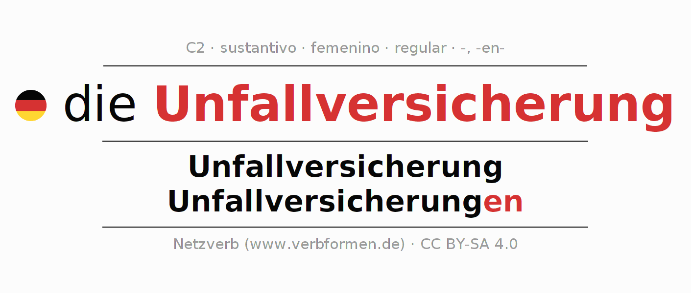 La declinación del sustantivo en forma de tabla con todas su formas: singular, plural y en los cuatro casos: nominativo (primer caso), genitivo (segundo caso), dativo (tercer caso) y acusativo (cuarto caso). Las construcciones gramaticales están representadas de forma clara en una tabla sinópica. La inflexión de los sustantivos es una ayuda durante tareas, exámenes, para cursos de alemán, la universidad, el estudio del alemán como lengua extranjera o como segundo idioma y para estudiantes adultos. La declinación correcta de las palabras es especialmente importante para los que aprenden el idioma alemán. Aquí encontraras más información acerca del tema Wiktionary Unfallversicherung y aquí también a través del Duden Unfallversicherung.