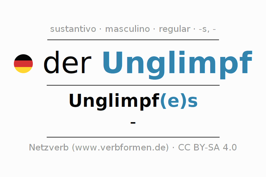 La declinación del sustantivo en forma de tabla con todas su formas: singular, plural y en los cuatro casos: nominativo (primer caso), genitivo (segundo caso), dativo (tercer caso) y acusativo (cuarto caso). Las construcciones gramaticales están representadas de forma clara en una tabla sinópica. La inflexión de los sustantivos es una ayuda durante tareas, exámenes, para cursos de alemán, la universidad, el estudio del alemán como lengua extranjera o como segundo idioma y para estudiantes adultos. La declinación correcta de las palabras es especialmente importante para los que aprenden el idioma alemán. Aquí encontraras más información acerca del tema Wiktionary Unglimpf y aquí también a través del Duden Unglimpf.